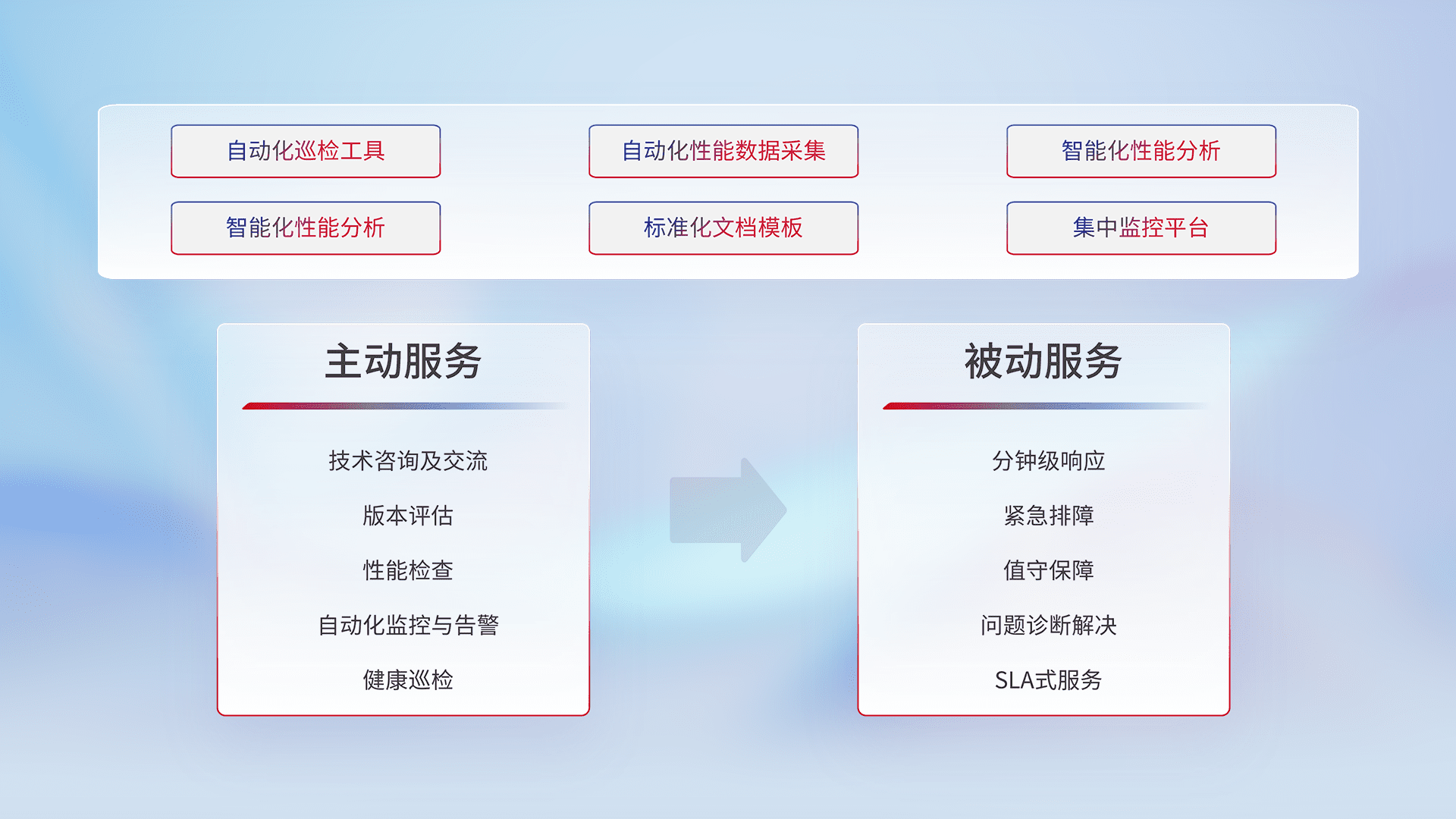 智能化工具和标准化文档,,保障服务质量,,,,提供主动服务(包含技术咨询、、版本评估、、、、性能检查、、、、自动化监控与告警、、、健康巡检)和被动服务包含(分钟级响应、、、紧急排障、、值守保障、、问题诊断解决、、、SLA服务)。。